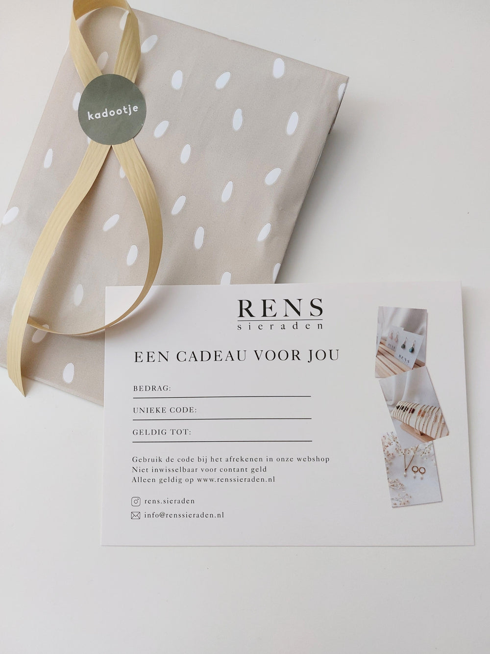 Twijfel je over het juiste sieraad als cadeau? Met een cadeaubon van RENS Sieraden geef je iemand de vrijheid om zelf een favoriet sieraad uit te kiezen. Zo weet je zeker dat je altijd goed zit!